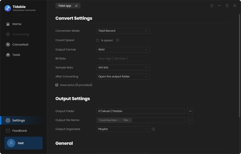 Tidabie Tidal Music Converter is a professional program designed exclusively for Tidal music. You can download songs, playlists, and albums from Tidal and convert them to common formats such as MP3, AAC, WAV, AIFF, ALAC and, FLAC format. Besides, the program featured the fastest downloading speed that can achieve a maximum of 10X conversion speed with ID3 tags kept. Most importantly, you will get the audio files with lossless audio quality after conversion. If you are a Tidal Individual tier user, the program can help you get the Hi-Fi/Hi-res Tidal music. Now let’s get started to download the Tidal songs to your local drive in WAV format.